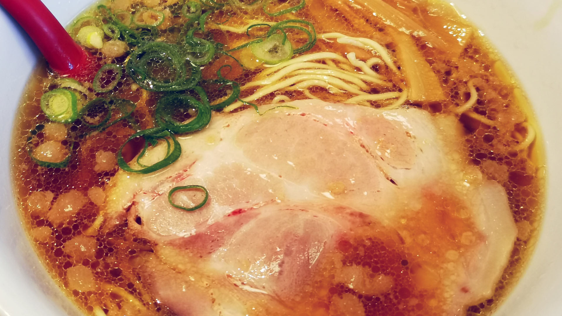 「大山鶏」と「親鶏」のチキンスープをベースに香味野菜、昆布、いりこ、アゴだし(焼きトビウオ)を煮込み、最後に3種類の削り節を加えたチキンと野菜と魚介のダブルスープ。尾道ラーメン特有のブタの背脂はやや控えめなのが残念ですが、あっさりとしたコクウマのスープは飲み飽きません。醤油ダレにもこだわりがあるとか・・・